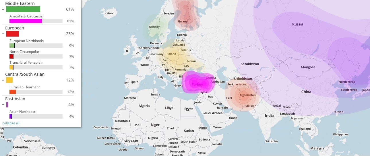 Test sonucu olarak aşağıdaki gibi bir haritada hangi coğrafya ile ne oranda akraba olduğunuzu görebilirsiniz.