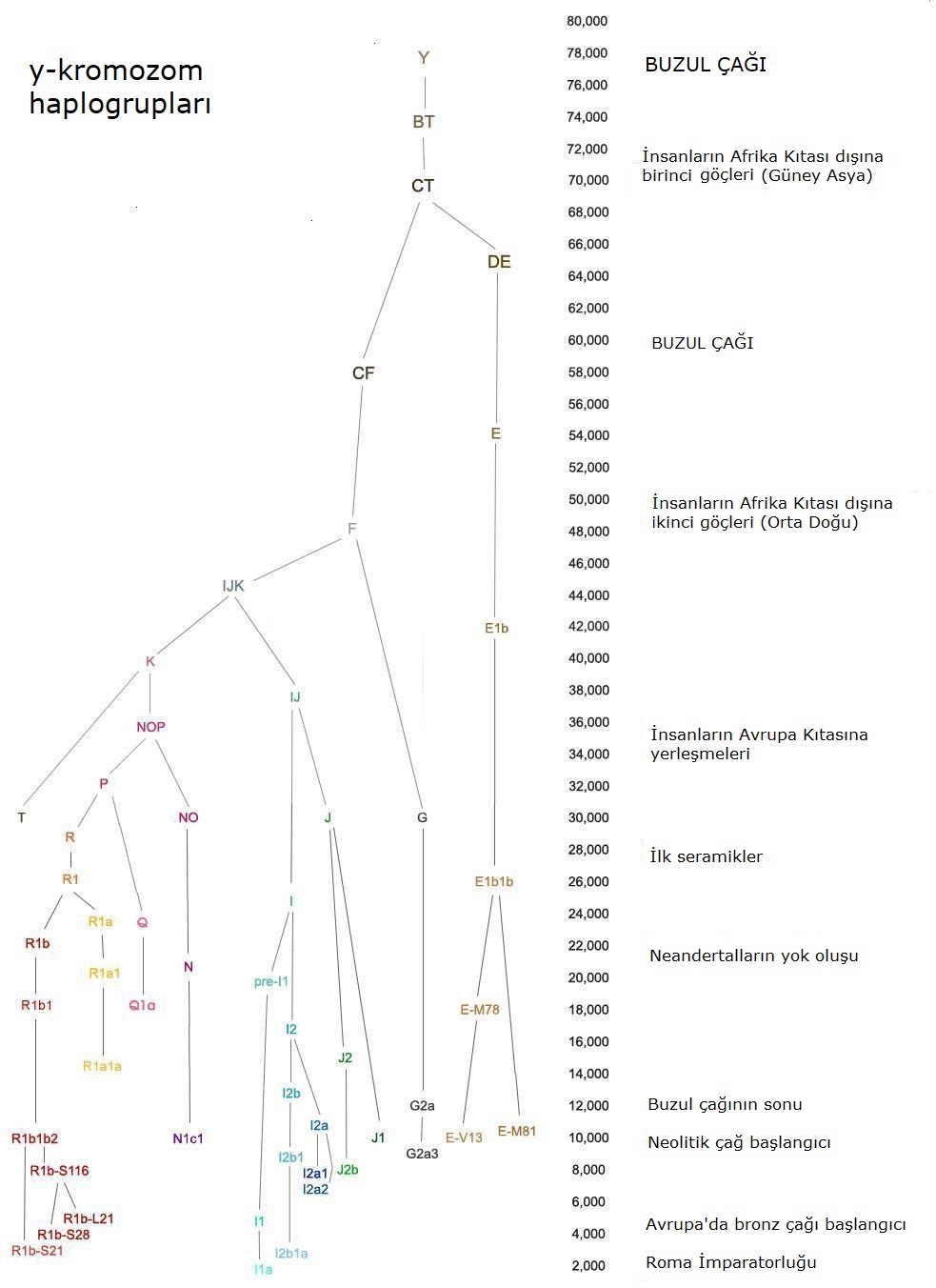 Y-kromozomunda meydana gelen her genetik değişim (SNP-Single Nucleotide Polymorphism) bir harf ile kodlanarak "Haplo-grup" adı veriliyor. Aşağıdaki kronolojik cetvele baktığımızda görüyoruz ki ilk SNP mutasyon ile BT Haplogrubu oluşuyor. Aradan birkaç bin yıl geçince bir başka genetik değişim CT haplogrubunu oluşturuyor ve bu değişimler dallanarak günümüze kadar devam ediyor. Bu makalede National Georgraphic verilerinden çok Dr. Stephen Oppenheimer ve Eupedia araştırmaları esas alındığından, yukarıda sözünü ettiğim gibi zamanlama farkları vardır.