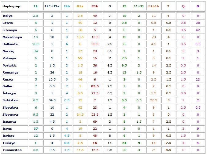 Bu noktada milliyetçilik kavramını tatsızlaştıran bir durumla karşılaşıyoruz. IJK için Rus, Alman, İngiliz, Fransız, İsveç, Türk, Arap diyemiyoruz, çünkü bu isimler sadece son birkaç bin yılda ortaya çıktı. Katı ırkçılar için gerçekten zor bir durum, bugün nefret ettiği millet ile aynı soydan olduğunu öğrenmek üzücü olsa gerek... Bu kadar bilgiden sonra artık Türkiye’ye gelme zamanıdır. Eminim ki buraya kadar yazdıklarımızı dikkatle okumuş olanlar yukarıdaki haritada Türkiye’nin grafiğine baktıklarında bu renklerden hangisinin Orta Asya’dan gelen atalara ait olduğunu bilmek istiyorlar. Sizi daha fazla meraklandırmayacağım, ama daha önce bir noktaya dikkatinizi çekmek istiyorum. Diğer ülkelerin gen grafiğine bakıp Türkiye ile karşılaştırdığınızda gözünüze çarpan ilginç bir şey yok mu? Mesela Rusya’nın yarısı sarı, Polonya’nın yarıdan fazlası, Fransa’nın %60’ı kırmızı, İngiltere hakeza büyük ölçüde kırmızı. Türkiye’ye baktığımızda adeta bir gen mozaiği görüyoruz, neredeyse hiçbir haplogrup baskın değil. Eğer yeşil renk dikkatinizi çektiyse karar vermekte acele etmeyin. Yeşil, J1 ve J2 gruplarını simgeliyor, bunlar Orta Asya doğumlu değil. Nitekim bu araştırmayı yapan kaynak Türkiye için özel bir not düşmüş, tercümesi aynen şöyle; “Türkiye, bu tabloya alınmayan Afrika ve Asya haplogruplarını da (A, ExE1b1b, C, H, L, O, R2) %8.5 oranında barındıran tek ülke…” Bu kadar millet olur da bunların arasında Orta Asya’dan göç eden ataların genleri olmaz mı, elbette var: Q haplogrubu, oranı %2. Bir başka Orta Asya/Sibirya haplogrubu ise N. Bugün özellikle Finlandiya ve Baltık ülkelerinde görülen bu genetik grubun da 20 bin yıllık Ural-Altay geçmişi var. Türkiye’deki oranı ise %4. Buna diğer Orta Asya ve Sibirya orijinli haplogrupları da eklersek yine de %10'u geçmiyor. Bilim bazen bizleri hayal kırıklığına uğratabiliyor. Q ve N haplogruplarının ortak atası ise 36 bin yıl önceki ‘NOP’ haplogrubu. Kronolojik cetvele baktığınızda kimlerle akraba olduğunuzu göreceksiniz. Evet, gözlerinize inanın, bütün Avrupa ve Orta Asya milletleri 36 bin yıl önce aynı soydan türediler. Tipik Avrupalılar olan R1a ve R1b'nin atası olan R haplogrubu 30 bin yıl önce Orta Asya’da doğdu. Pek çok kişinin gen testine sıcak bakmadığını biliyorum. Son zamanlarda komplo teorilerine iyice kendimizi kaptırmışken birilerinin bu genetik araştırmaları şiddetle reddedeceğini de tahmin edebiliriz. Ama Galileo’nun dediği gibi bilim inkar kabul etmiyor, bazıları ‘hayır olmaz’ dese de Dünya dönmeye devam ediyor. Sanıyorum benim gibi merak yönü paranoyasından ağır basanlar biraz tedirgin olsalar da “bir de ben öğreneyim atalarımın kimler olduğunu” diyeceklerdir. Bilim insanları bu hızla giderlerse yakın bir gelecekte bütün insanlığın soyağacını yapacaklardır, sanıyorum herkes çok yakında kiminle ne kadar akraba olduğunu öğrenecek. Genetik soyağacı sadece bireylerin hayata bakışlarını değil, belki devlet yapılarını da sarsacak yeni bir çığır açmak üzere dersek biraz abartmış mı oluruz? Bence hayır, belki bu konunun önemini ifade etmek için bugün söyleyeceğimiz her şey az bile kalır. Kırmızı hapı alıp bir an önce gerçekle yüzleşmeyenlerin başı yakın gelecekte çok ciddi ağrıyabilir. Bu genetik çalışmaların Fransa’dan dünyaya 200 yıl önce yayılan ulus-devlet modelini nasıl etkileyeceğini önümüzdeki yıllarda göreceğiz. Bugünkü millet anlayışımızın temeli dile dayanmaktadır. Yani aynı dili konuşan insanlar aynı milletten sayılırlar. Dillerinin yakın olduğu nispette milletler birbiriyle akraba olarak kabul edilir. Türkçe - Özbekçe - Azerice gibi... Ama diğer taraftan genlere baktığımızda Ural-Altay dil grubunun lehçelerini konuşan bu milletlerdeki Sibiryalı ataların geni çok az iken Finlandiya’da %58 gibi büyük bir oranda karşımıza çıkıyor. Görünen o ki bilim geçmişte pekçok defa yaptığı gibi dogmaları bir kez daha yıkmak üzere. Bazı rejimler varlıklarını devam ettirmek istiyorsa "ulus" kavramını bilimsel verilere göre yeniden tanımlamak zorundalar. Bu durumu şu an için tehlike olarak görmeyeneler unutmamalıdır ki, Fransız ihtilali akabinde kraliyet giyotin altında son bulurken Osmanoğulları yeni doğmuş olan ulus-devlet modelini kendi saltanatı için bir tehlike olarak görmüyorlardı. Ancak geleceği görmeyi başaran ve yeni şartlara adaptasyon sağlayan kraliyet aileleri bir şekilde varlıklarını sürdürüyorlar. Galiba öngörü yeteneği herkese nasip olmayan bir ayrıcalık... İlgilenenler Avrupa ülkelerinde bulunan haplogrupların % oran tablosunu aşağıda görebilir. Buna milletlerin akrabalık derecesi de diyebiliriz. Tabii bütün bunlar y-kromozomunun hikayesi, yani baba tarafından soyağacı. Bir de mitokondrial DNA testi var, acaba anne tarafından kim kiminle akraba? Belki bir dahaki sefere de onu anlatırım.Murat D. Mirza