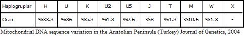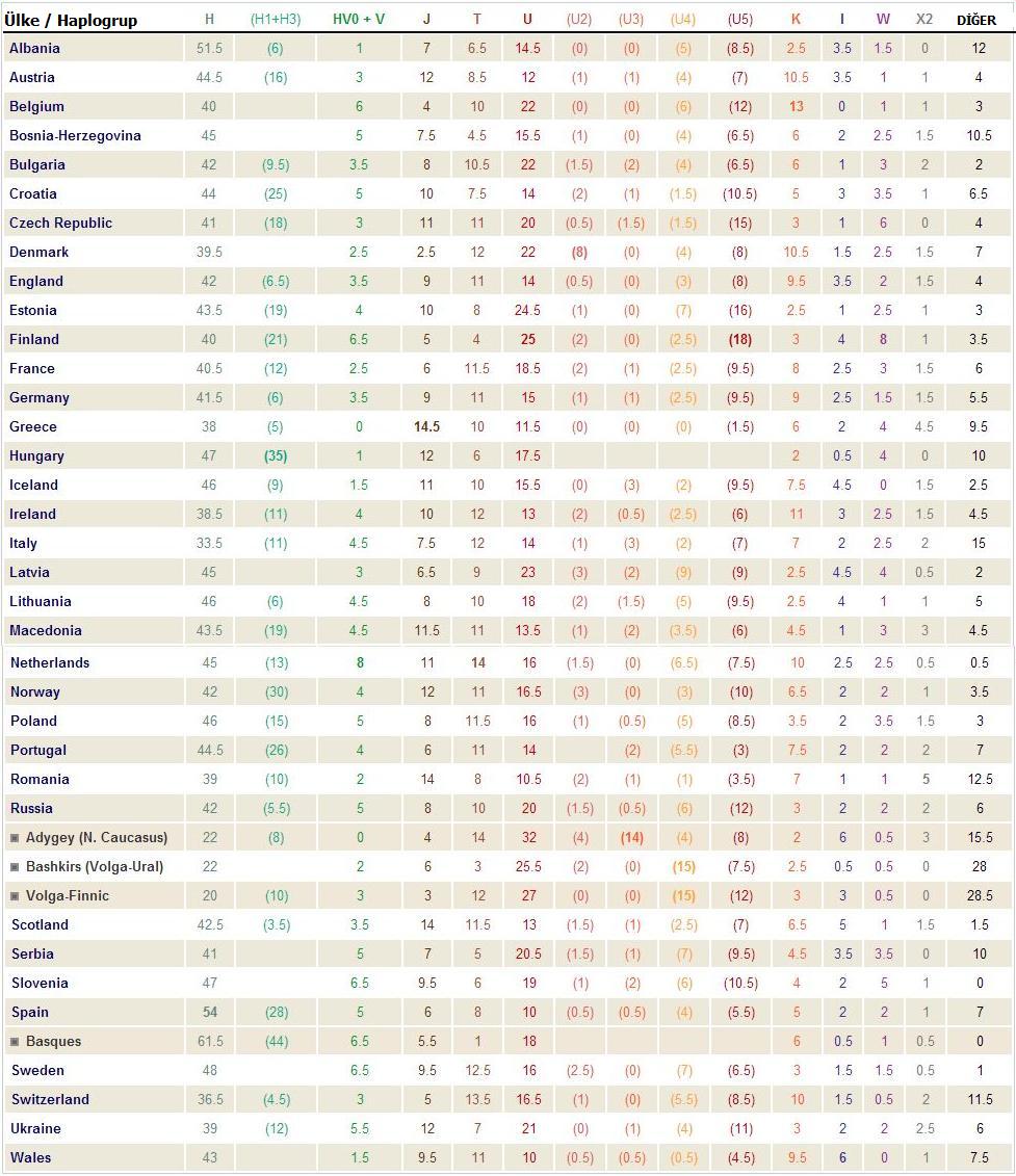 Ayrıca, aşağıdaki tabloyu inceleyerek Avrupalı milletlerle (anne tarafından) ne oranda akraba olduğumuzu görebilirsiniz. Türkiye nüfusu üzerine yapılan mt.DNA araştırmaları henüz yeterli düzeyde olmasa da bu istatistikler genel bir fikir edinmemize yardımcı olmaktadır.